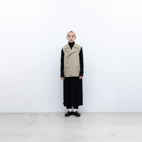 75dのポリエステル糸で織った高密度のタフタです。微起毛と皺加工を入れているため柔らかくぬめりのある風合いに仕上がっています。とても軽くシワになりにくい素材です。年間通しての素材です。今季は全ての型に三菱ケミカルのコアブリッド中綿をキルティングした裏地を使用しています。中綿が入っていてもとても軽量で着やすい素材です。