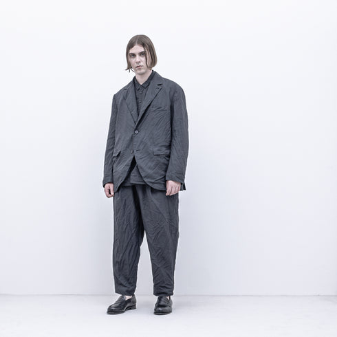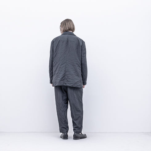 ポリエステルの製品染めは色やサイズ・ロットによって生地の皺感や質感が異なります。また個体差も大きく皺以外にも風合いも大きく異なる場合があります。これはポリエステルの製品染めの特徴ですのでご了承ください。この生地は特に荒めに織っているためサイズも個体差も大きくシワ感や風合いも個体差が大きく出ます。