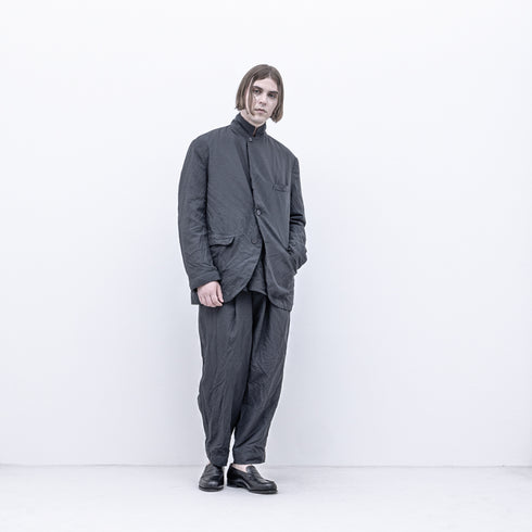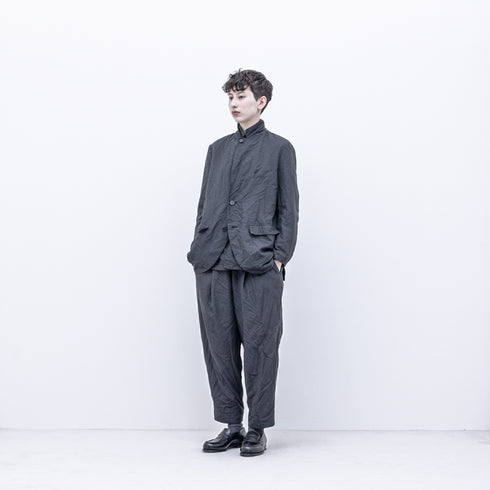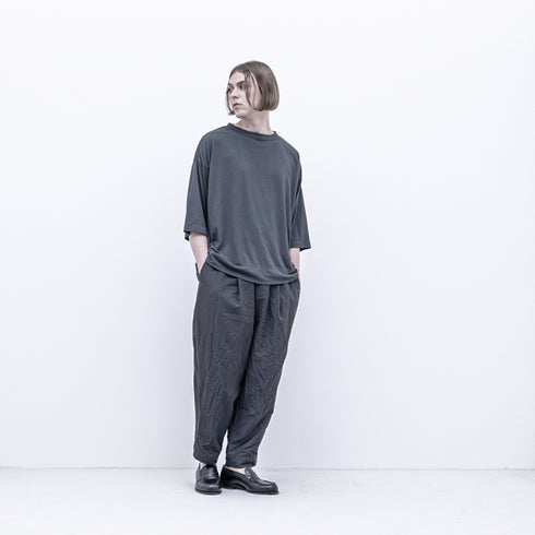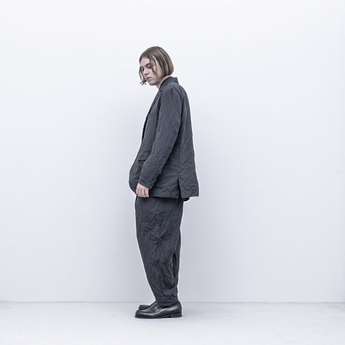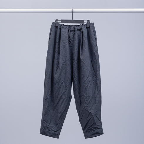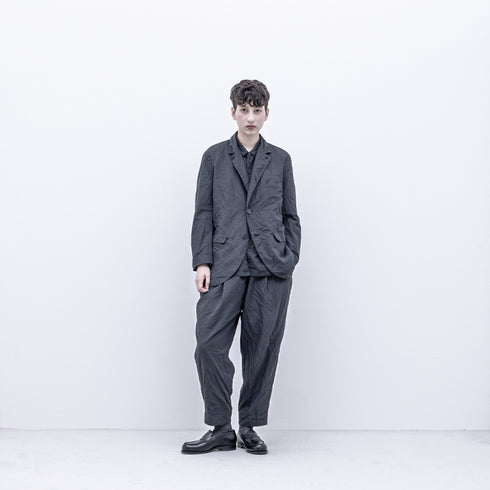 ポリエステルの製品染めは色やサイズ・ロットによって生地の皺感や質感が異なります。また個体差も大きく皺以外にも風合いも大きく異なる場合があります。これはポリエステルの製品染めの特徴ですのでご了承ください。この生地は特に荒めに織っているためサイズも個体差も大きくシワ感や風合いも個体差が大きく出ます。