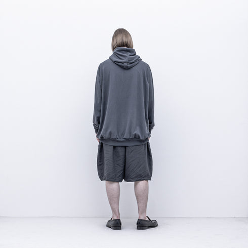 スパンポリエステル糸で編んだ裏毛組織のカットソー生地を製品後にポリエステル染めで染めています。
